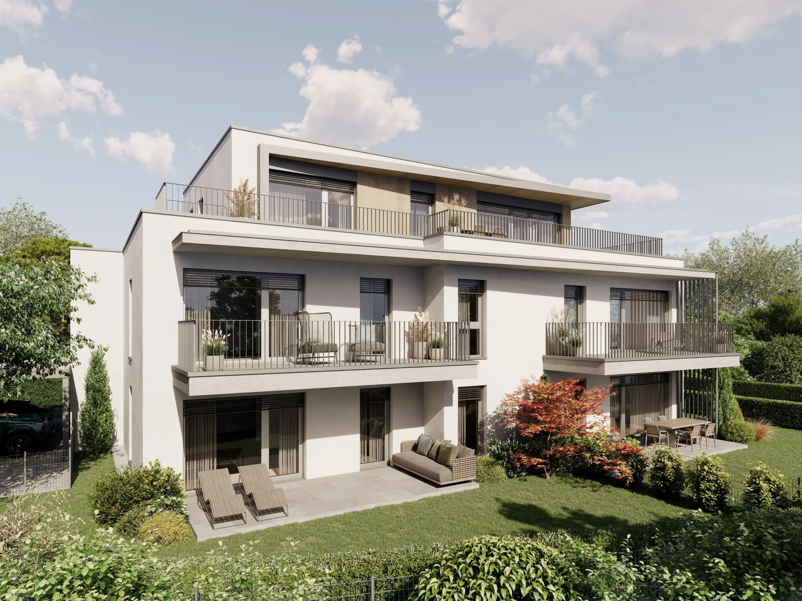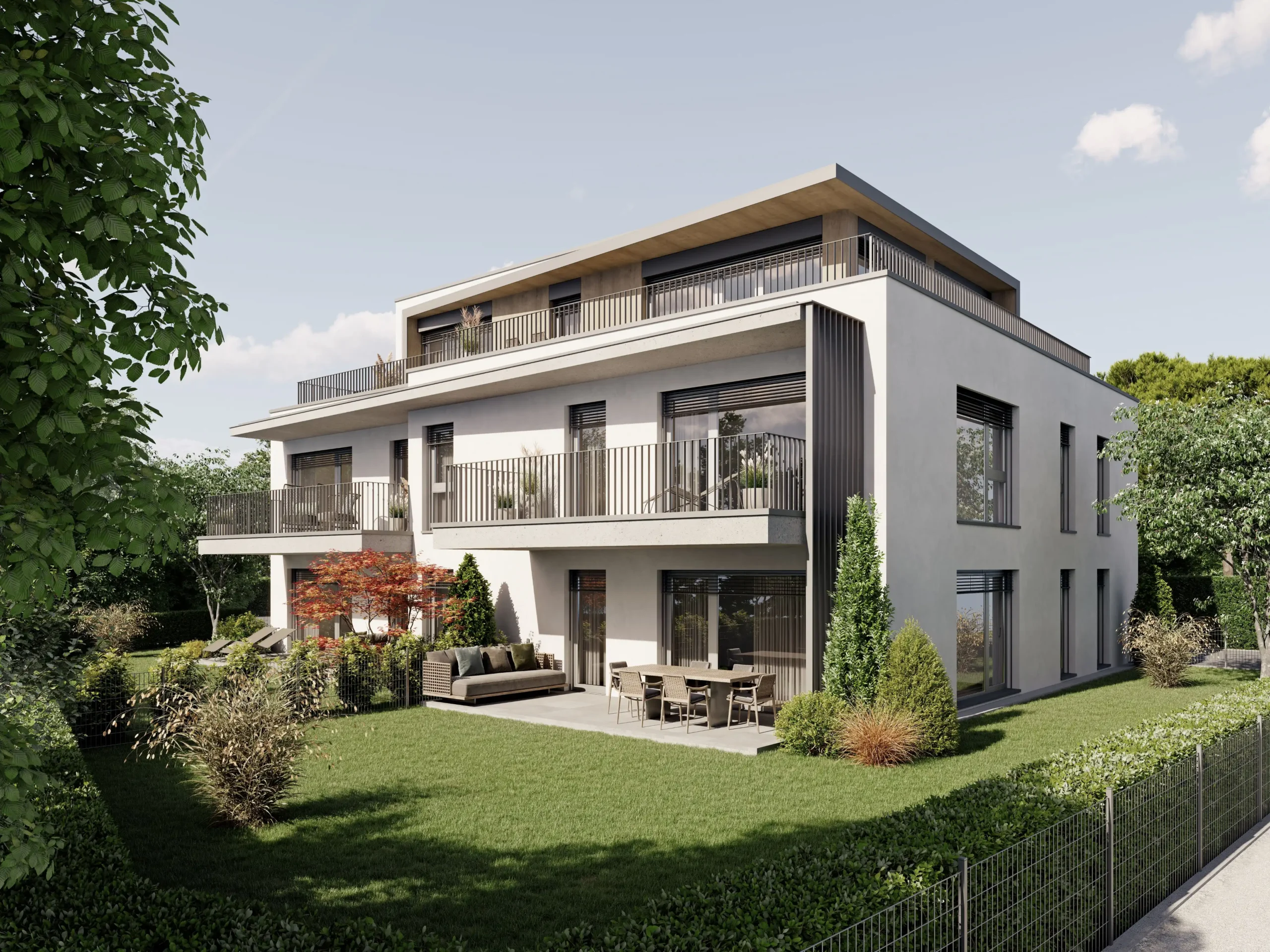 Die Wohnanlage überzeugt durch eine zeitlose Architektur, durchdachte Grundrisse und eine hochwertige Bauausführung. Großzügige Fensterflächen sorgen für helle, freundliche Wohnräume und ein angenehmes Wohngefühl. Jede Wohnung verfügt über private Freiflächen wie Balkon, Terrasse oder Garten, die zusätzlichen Wohnkomfort bieten.